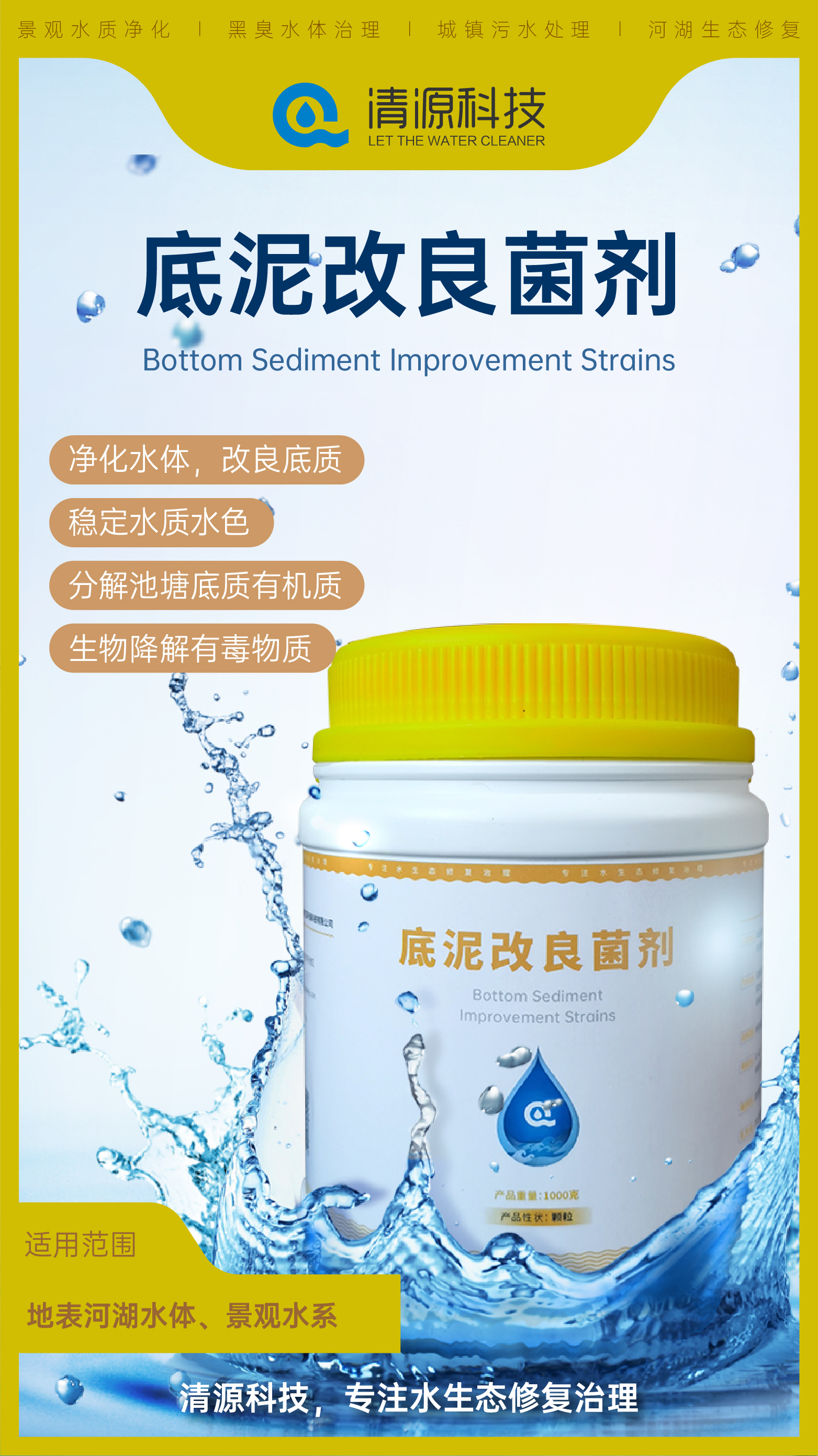 本工艺采取向受损的景观水体中投加微生物菌剂的方式,通过微生物的菌群作用消灭水体中的有害元素,同时对水体中的净水微生物进行原位培育,使其增殖数百倍,形成庞大而又稳定的微生物菌群,利用微生物的新陈代谢作用对水中污染物进行转移、转化及分解;在充氧的环境中,有益微生物可以高效分解有机沉积物,同时为上层生物链提供营养,鱼类生长加快,重量增加。微生物菌剂的投加可以最大程度地恢复水体的自净能力,使水质得到净化修复。